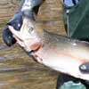 | Here Come the Trout! Trout fall from the net, like candy dropping from a piñata. Momentarily stunned, the fish collect en masse. A mixture of brook, brown and rainbow trout swim in circles at the spot of their release. Twelve inch long rainbows shimmer in the water, but look like bait fish swimming beside gigantic four and five pound brown trout. (read more) |