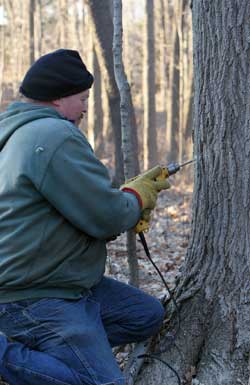 A steady groan, from the portable generator on the back of the pickup truck, disrupts the silence of the woods. A long yellow extension cord winds through the trees until it ends at an electric drill firmly embedded in the hands of a local farmer. It is difficult to bore a hole into the tree, and the drill whines as it struggles to shred the wood fibers. Sawdust falls to the ground as the bit is removed. A quick puff of air from the farmer’s mouth clears any remaining debris from the hole.