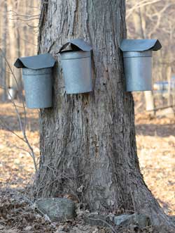 An assemblage of galvanized steel buckets hangs from the trees along the forest’s edge. Small specimens support a lone bucket, while mature trees bear the weight of two or three containers. Listen carefully and you can hear the sound of sweetness, as the trees play their seasonal song with the orchestrated drip of maple sap.